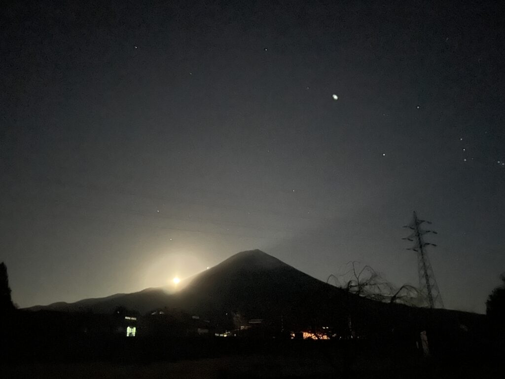 カーテン開けたら月と富士山がええ感じに。これにはホントに感動した。