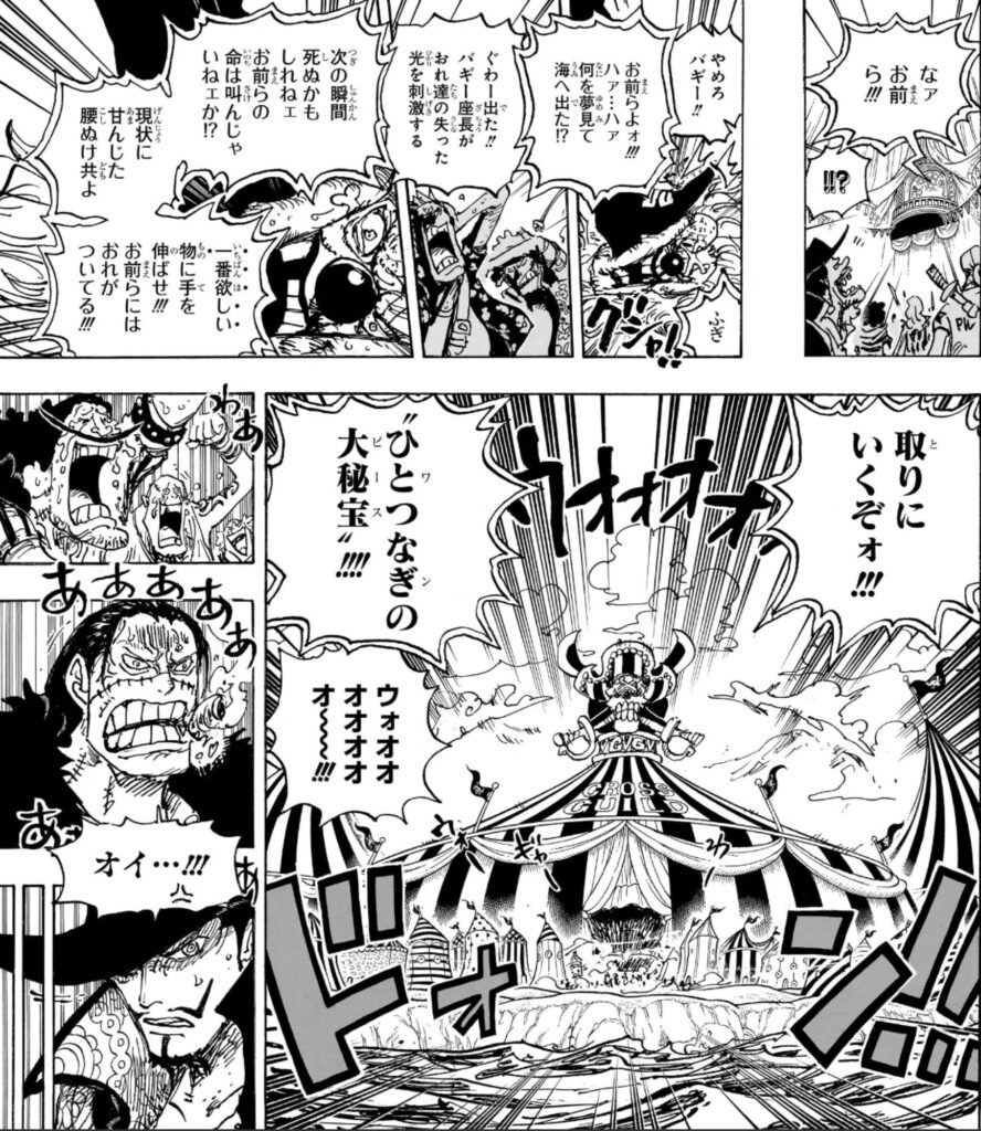 このシーンでバギーが「お前らよ! 何を夢見て海へ出た!」って言うんですが、この本質を捉えてる感じがたまらない。「一番欲しいものに手を伸ばせ!」こういう言葉が妙にぶっ刺さる年齢になった。このシーンは割と最近の方なのですが、この言葉を聞いてからずっと頭から離れません。ありがとう、バギー!w